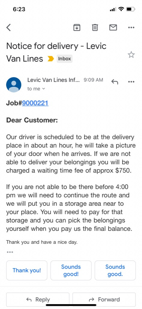 Levic also promised delivery on 7/1/21 and showed up on 7/8/21 costing me $699.33 in lost rent.
